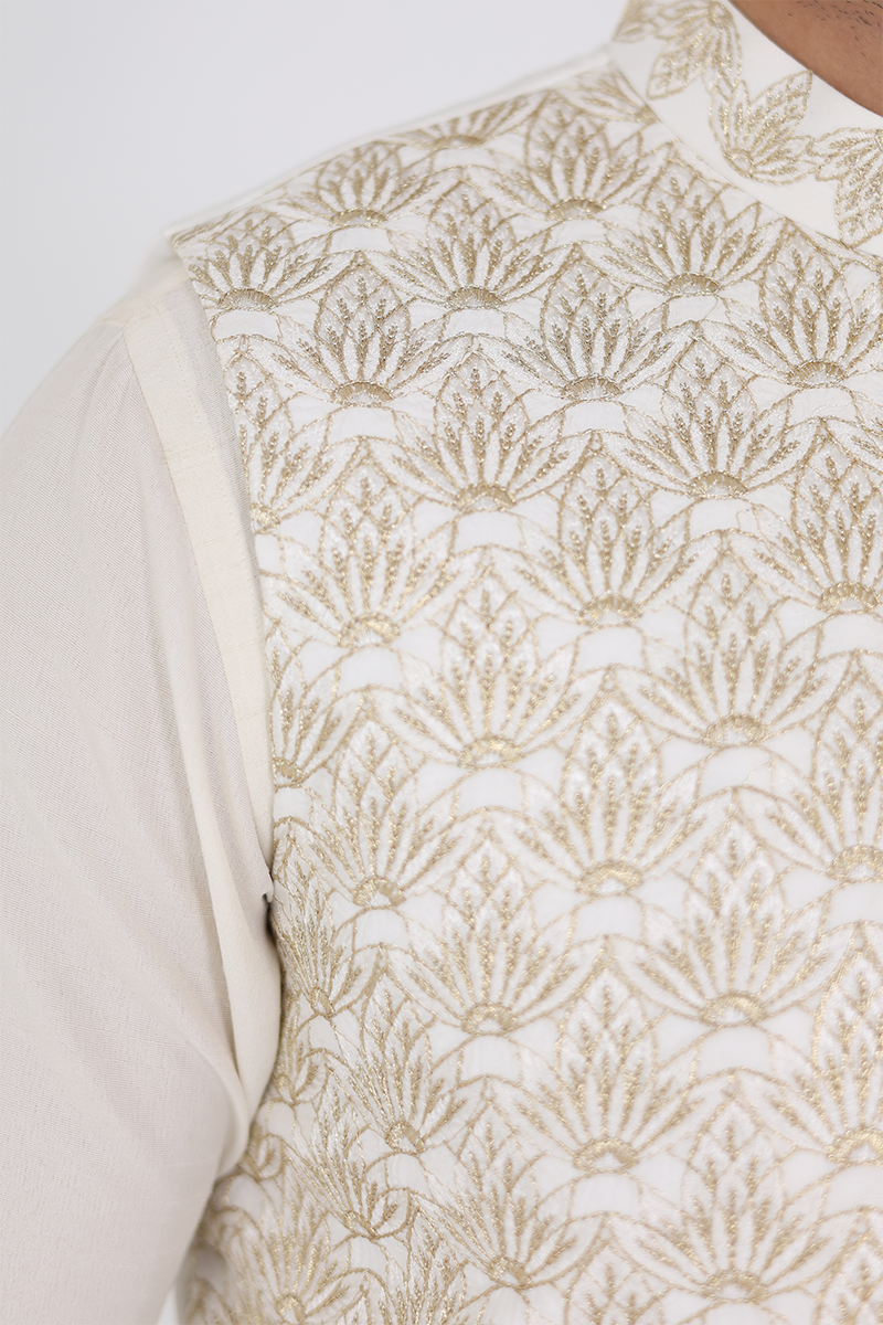 Tajveer in white captures the grandeur of Eastern heritage with its poised and graceful design. Crafted in a cream-toned fabric, the waistcoat features all-over thread embroidery in matching hues, creating a harmonious play of texture and depth. The intricate patterns flow seamlessly across the surface, lending a refined and regal charm.